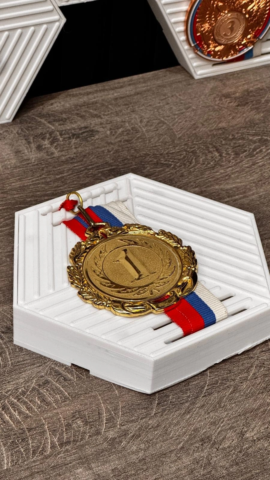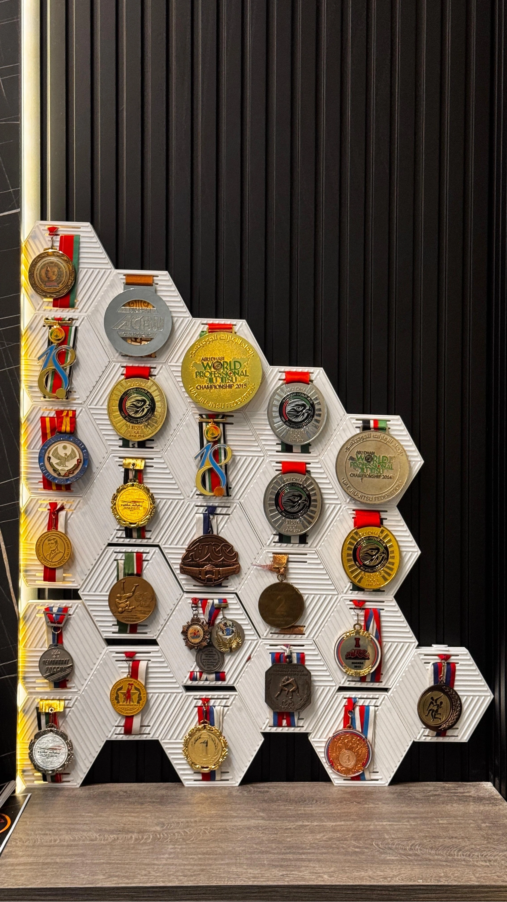 Özel tasarım simetrik altıgen madalya standımız, kazandığınız her madalyayı şık birer dekorasyon objesine dönüştürür. Modüler yapısı sayesinde birden fazla ürünü birbirine ekleyerek duvarınızda dev bir başarı peteği (honeycomb) oluşturabilirsiniz.